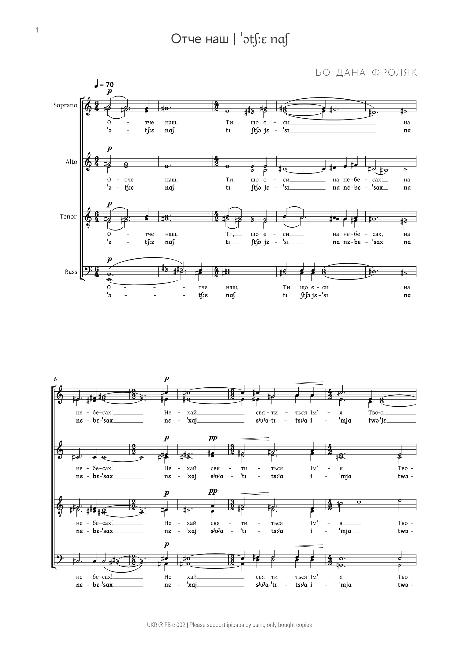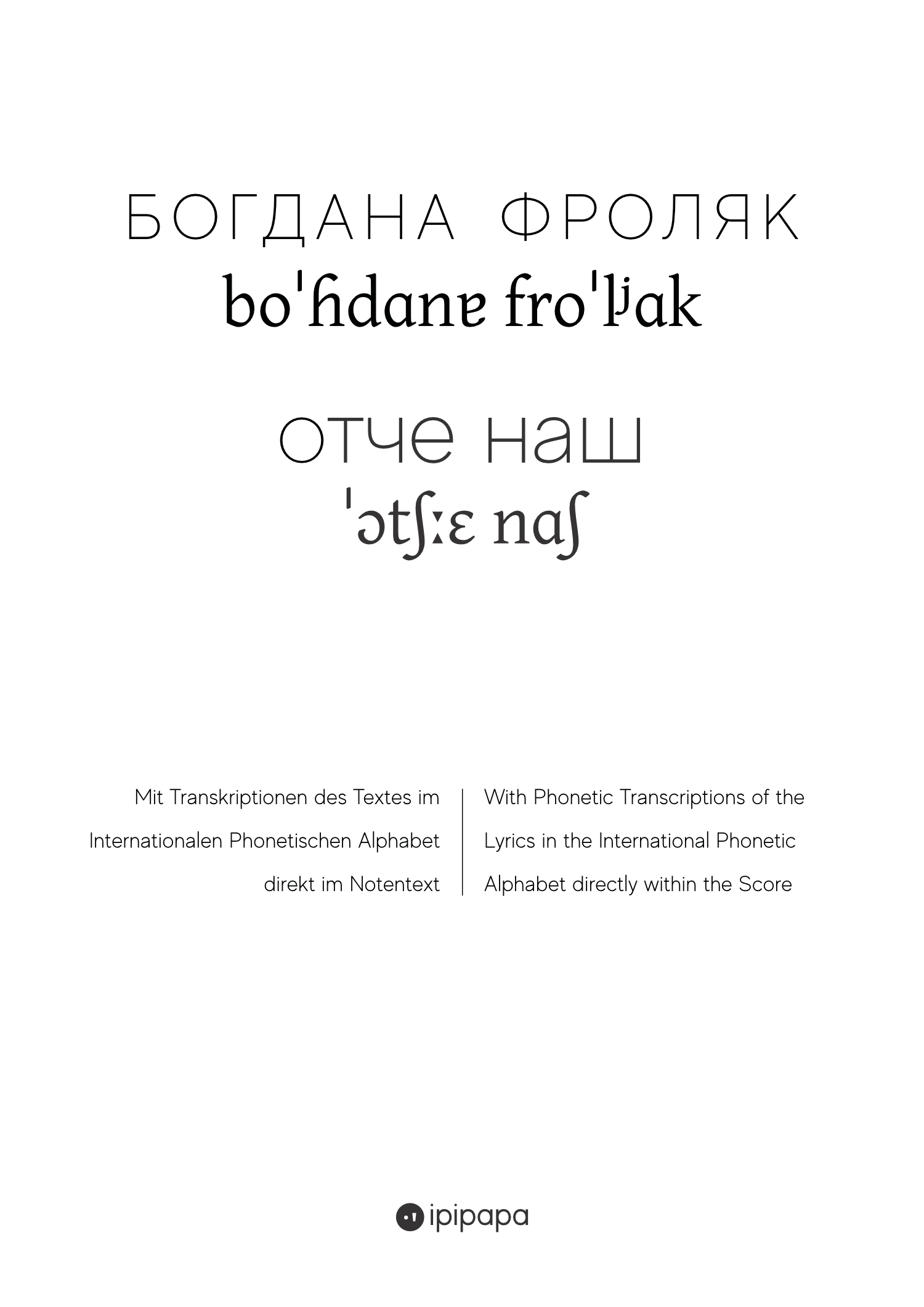 "Otche nash" is a choral piece (SATB) by the Ukrainian composer Bohdana Frolyak, based on the traditional prayer "Our Father". The music is characterized by its clear, harmonious melodies and emotional depth, which are carried by the powerful voice of the choir. A special feature of the piece is the integration of phonetic transcription in the sheet music, which enables the choir to sing the text even if they do not speak Ukrainian. This makes "Otche nash" an accessible and yet culturally authentic work for choirs from all over the world.