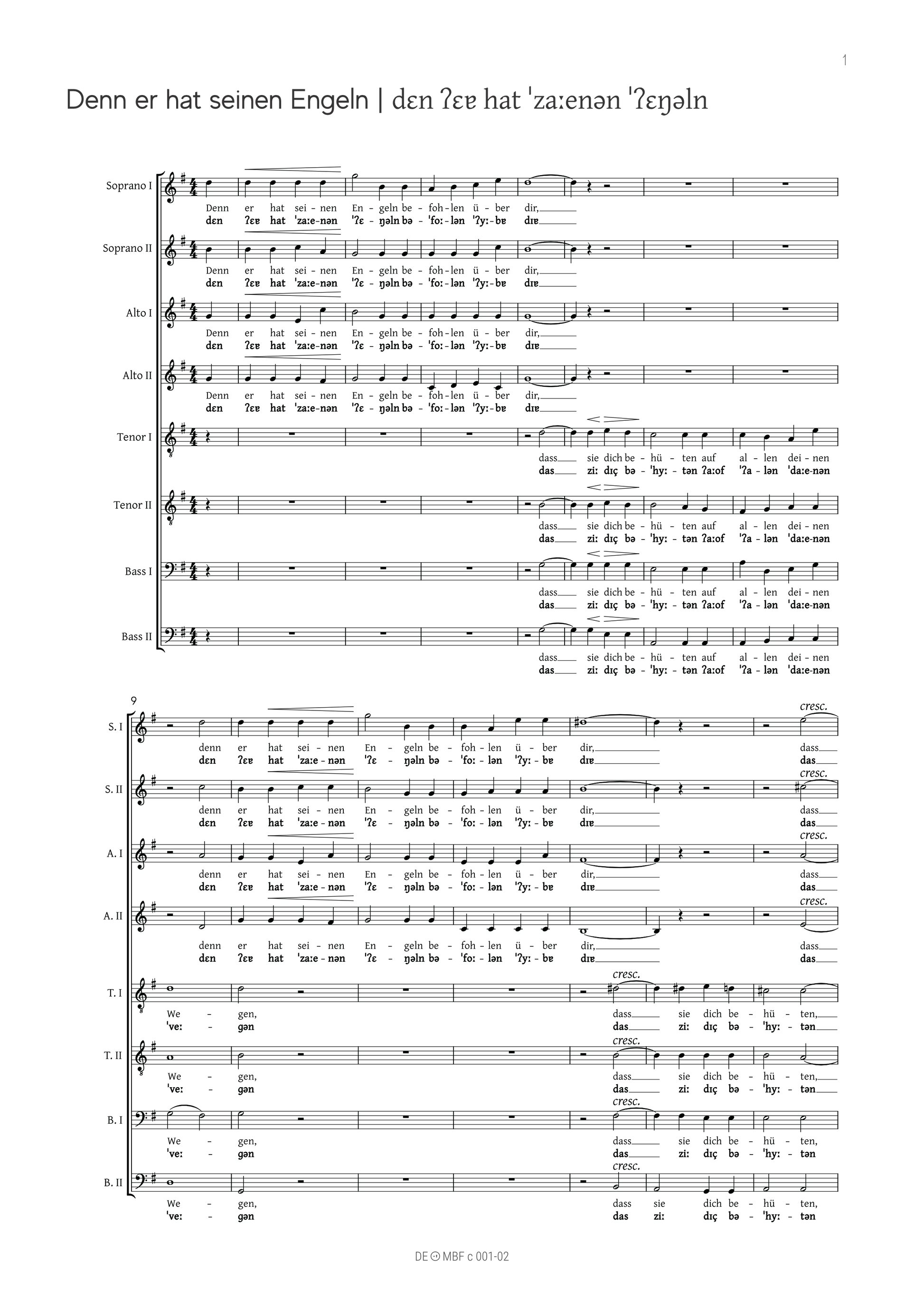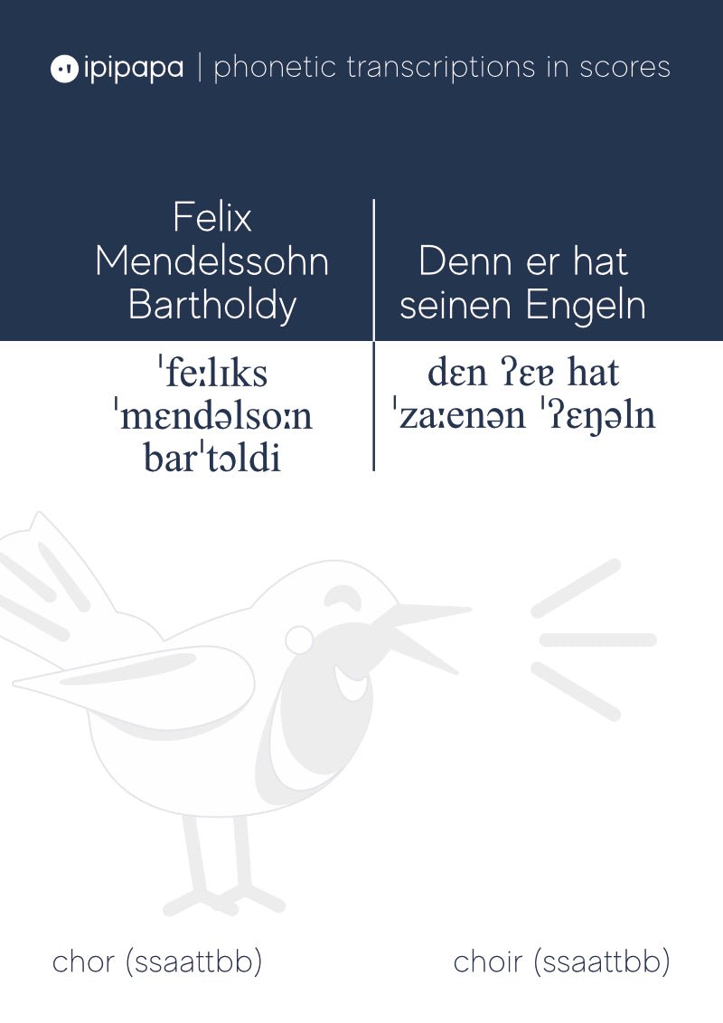 Discover the work "Denn er hat seinen Engeln befohlen" by Felix Mendelssohn Bartholdy, now at ipipapa with phonetic transcription directly in the sheet music. Our sheet music is perfect for singers who want to sing in a foreign language or perfect singing in their own language. "Denn er hat seinen Engel befohlen" is a motet for eight-part choir a cappella. He wrote it for the Berlin Cathedral in 1844, setting verses 11 and 12 from Psalm 91. Mendelssohn later added an accompaniment to the motet and it became part of his oratorio "Elias". The motet was published in 1844.